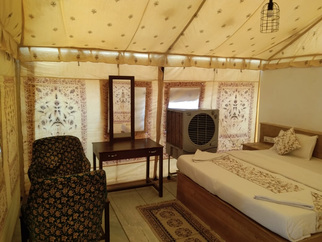 Accommodation in Swiss Tents is something that people come to Jaisalmer for. Our Deluxe Swiss Tents are very spacious and has attached toilet and bathroom. These Swiss tents demonstrate the skills and designs of the local handicrafts combined with the best and most modern amenities.